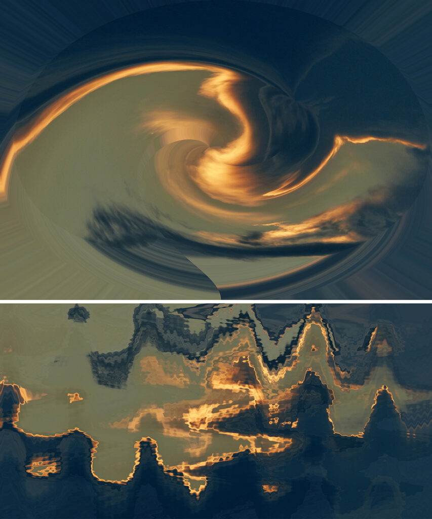A művek némelyike kiindulási alapként fényképeket használva készült. Ezek alkotóik kísérletező kreativitása, a rétegek, variációk sokaságából kiszűrt, szoftverek által feldobott egyenmegoldások kikerülésével készült egyéni látásmódot tükröző alkotások. Pataki Tibor Anyakönyv című munkája könyvek és egy arcmás fotóit használva formál a technika segítségével virtuális plasztikát, míg Márián Gábor Vertigo című műve egy nőalakot ábrázoló kép módosítása során létrehozott hullámzással kelt valóban szédítő hatást. Számos alkotás középpontjában egy hangulat, érzelem, érzetek közvetítése áll. Lieber Erzsébet Caspar D.F. nyomában címet viselő képe számomra a víztükör csillogását, a lemenő nyári nap színeit, melegségét és melankóliáját idézi. Gyönyörűen adja vissza a 18-19. századi festő romantikus természetábrázolását a mai kor alkotói eszközéivel.